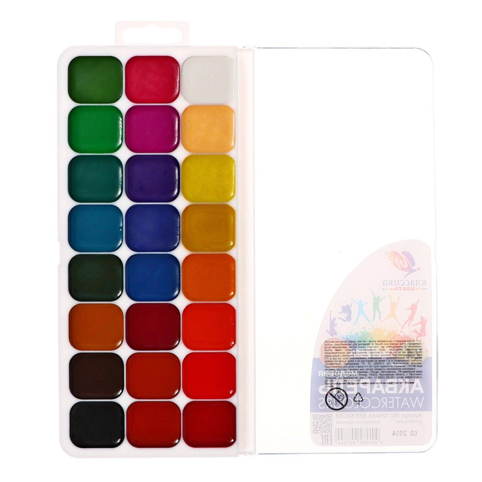 Acuarela pe baza de miere, in ambalaj de plastic cu capac transparent, cuve patrate, fara pensula. Acuarela LUCI, in set de 24 culori pentru creativitatea copiilor cu culori luminoase si pure, realizata dupa reteta clasica folosind miere. Se spala perfect si se intinde pe suprafata hartiei. Vopselele se amesteca intre ele, mentinand saturatia culorii. Setul contine 24 culori: alb, bej, lamaie, galben, galben inchis, portocaliu, rosu, rubin deschis, roz, liliac, violet, albastru, albastru deschis, visiniu, ocru rosu, oxid de fier rosu, verde, verde deschis, verde smarald, turcoaz, verde , ocru, cafeniu, negru.