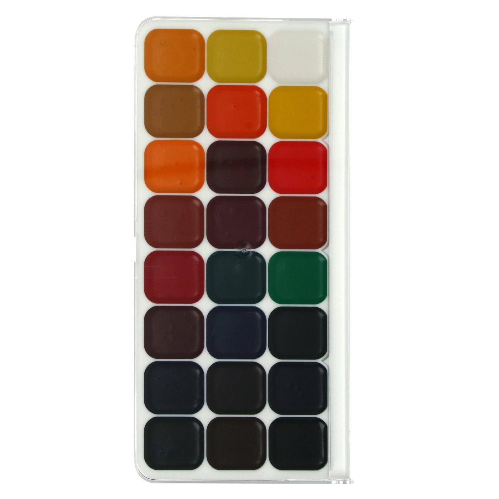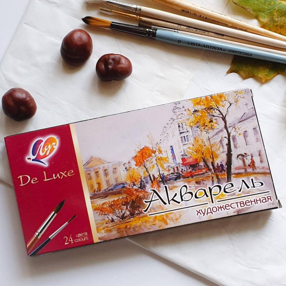 Acuarela artistica LUCI De Luxe 24 culori este realizata pe baza de lipici vegetal-guma arabica, cu un continut ridicat de pigment de inalta calitate. Prezenta si raportul necesar al acestor componente in acuarela ii confera o transparenta extraordinara, o puritate crescuta a culorii si o intensitate a tonului. Acuarela poate fi folosita in mai multe straturi. Acuarela LUX are o puritate (saturatie) a culorii mai mare fata de acuarela obisnuita, ceea ce permite, pe langa o mai buna perceptie vizuala, pentru a extinde gama de culori atunci cand amestecati vopselele la o varietate infinita de optiuni pe care un adevarat maestru le va aprecia. In plus, paleta de acuarela Lux are o selectie variata de nuante de albastru, verde, rosu si galben.Acuarela este ambalata in cutie de plastic cu capac transparent, si intr-o cutie de carton colorat. Setul contine 24 de culori: alb, galben, stacojiu, rosu ocru, galben-verde, verde, albastru, negru, lamaie, portocaliu, roz, visiniu, verde smarald, albastru azur, violet, maro, galben inchis, ocru, galben - portocaliu, oxid de fier rosu deschis, carmin, violet-roz, albastru, verde original.