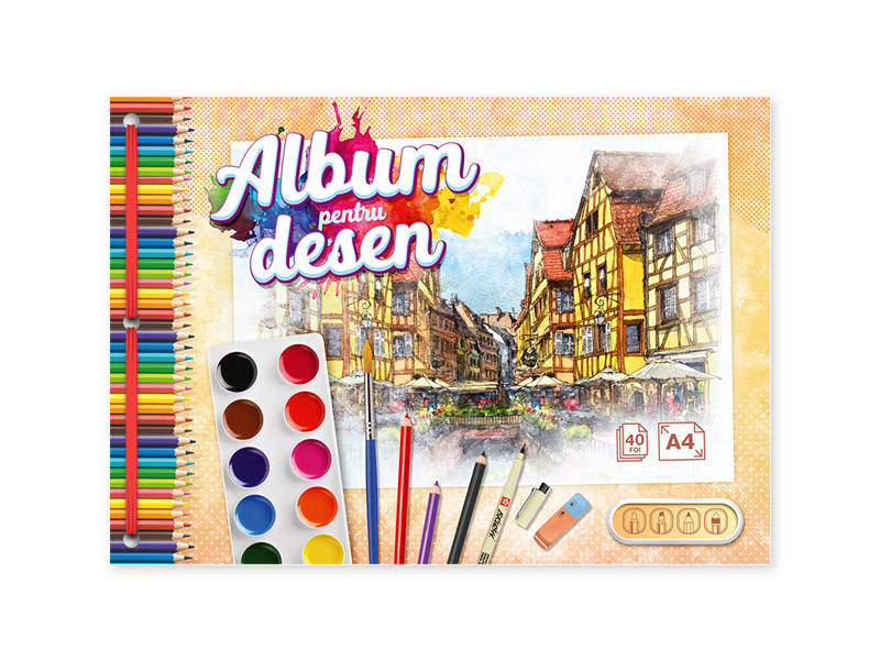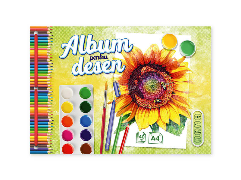 Album pentru desen cu legaturi, este un instrument excelent pentru implementarea ideilor creative la lectiile de arta. Formatul albumului - A4, 205x295 mm. Coperta este din carton cretat cu o densitate de 250 gr/m2. Blocul intern este format din 40 de foi. Grosimea hartiei offset este de 100 gr/m2. Este potrivit pentru desen cu diferite tipuri de vopsele, carioci, creioane colorate, creioane grafit si pixuri cu gel. Ambalaj 20 bucati.