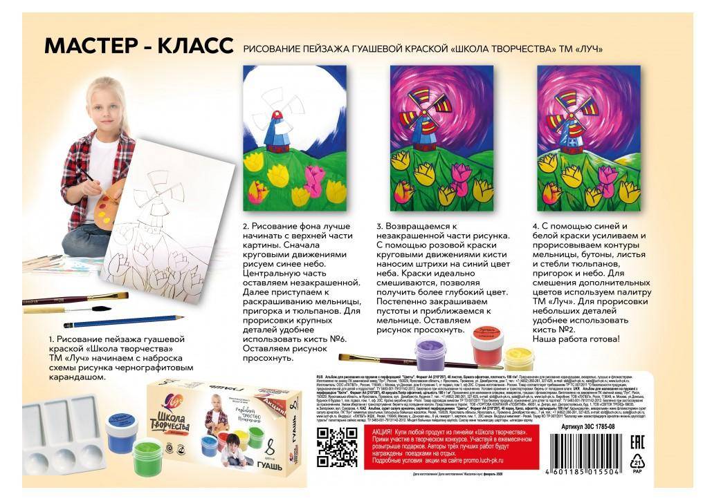 Album pentru desen Scola tvorcestva, pe spirala, este un instrument excelent pentru implementarea ideilor creative la lectiile de arta. Formatul albumului - A4, 210x297 mm. Coperta este din carton cretat cu o densitate de 190 gr/m2. Pe coperta exista un masterclass de desen pas cu pas. Blocul intern este format din 40 de foi, toate foile au perforatie (linie de rupere). Grosimea hartiei offset este de 100 gr/m2. Este potrivit pentru desen cu diferite tipuri de vopsele, carioci, creioane colorate, creioane grafit si pixuri cu gel.