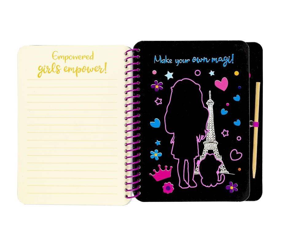 Caiet-gravura LITTLE GIRL BIG DREAMS. Setul include: 15 pagini negre cu sabloane, 15 pagini cu teme pentru notite, si racleta. Folosind o racleta, pe foi apar imagini colorate. Dimensiune: 170 x 210 mm.