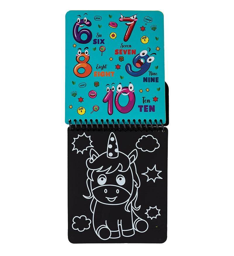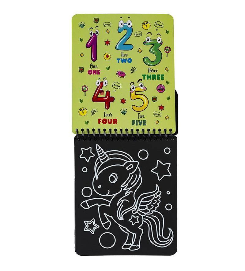 Caiet-gravura UNICORN. Setul include: 8 foi negre cu sabloane si o racleta din bambus. Si, de asemenea, numere si alfabet englezesc. Folosind o racleta, pe foi apar imagini colorate. Dimensiune: 160 x 190 mm.