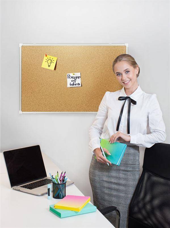 Tabla informationala din pluta cu dimensiunea 60x90 cm este destinata plasaii notitelor si materialelor informative folosind pioneze. Datorita ecologicitatii sale, pluta naturala este ideala atat pentru spatiile publice, cat si pentru casa. Cadrul din aluminiu garanteaza rezistenta structurala si durata lunga de viata. Dispune de montare orizontala si verticala.