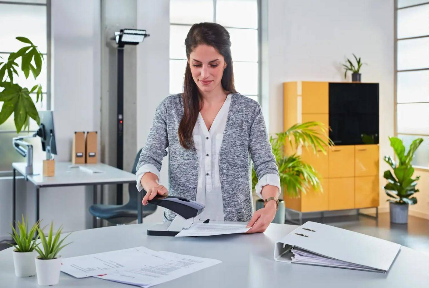 Rigla din plastic cu formaturile hartiei, cu marcaje de dimensiune usor de citit. Baza antiderapante care poate fi deschisa la jumatate pentru golire si inchisa din nou. Mecanism integral din metal si corp lucios din plastic. Culoare negru-gri.