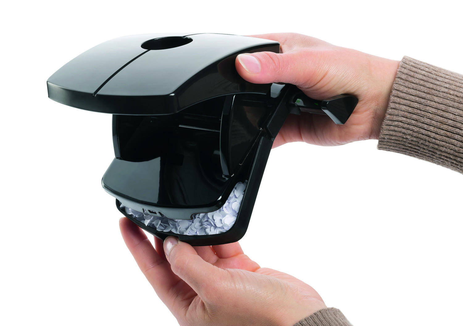 Rigla din plastic cu formaturile hartiei, cu marcaje de dimensiune usor de citit. Baza antiderapante care poate fi deschisa la jumatate pentru golire si inchisa din nou. Mecanism integral din metal si corp lucios din plastic. Culoare negru.