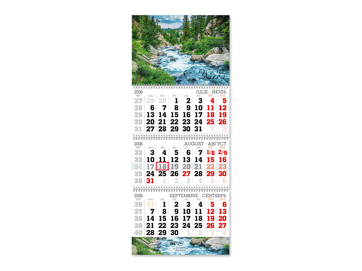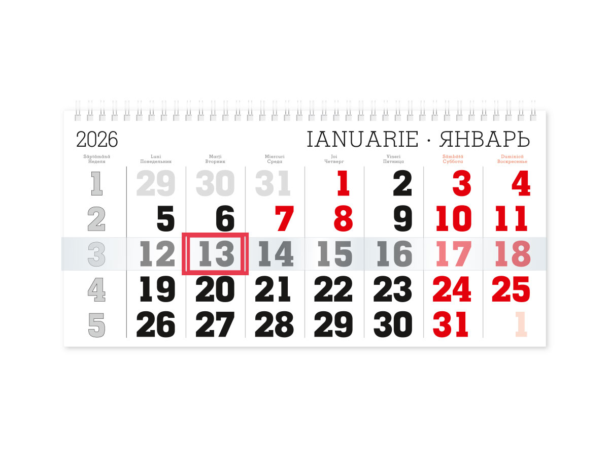 Calendar trimestrial 2026 Oficiu, conceput pentru planificarea afacerii. Pentru usurinta in planificare, este format din 3 blocuri cu grile calendaristice pentru trei luni - anterioara, curenta si urmatoare. Cursorul glisor evidentiaza data curenta.
