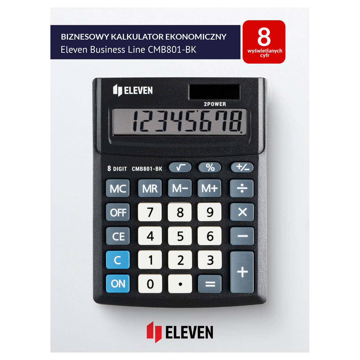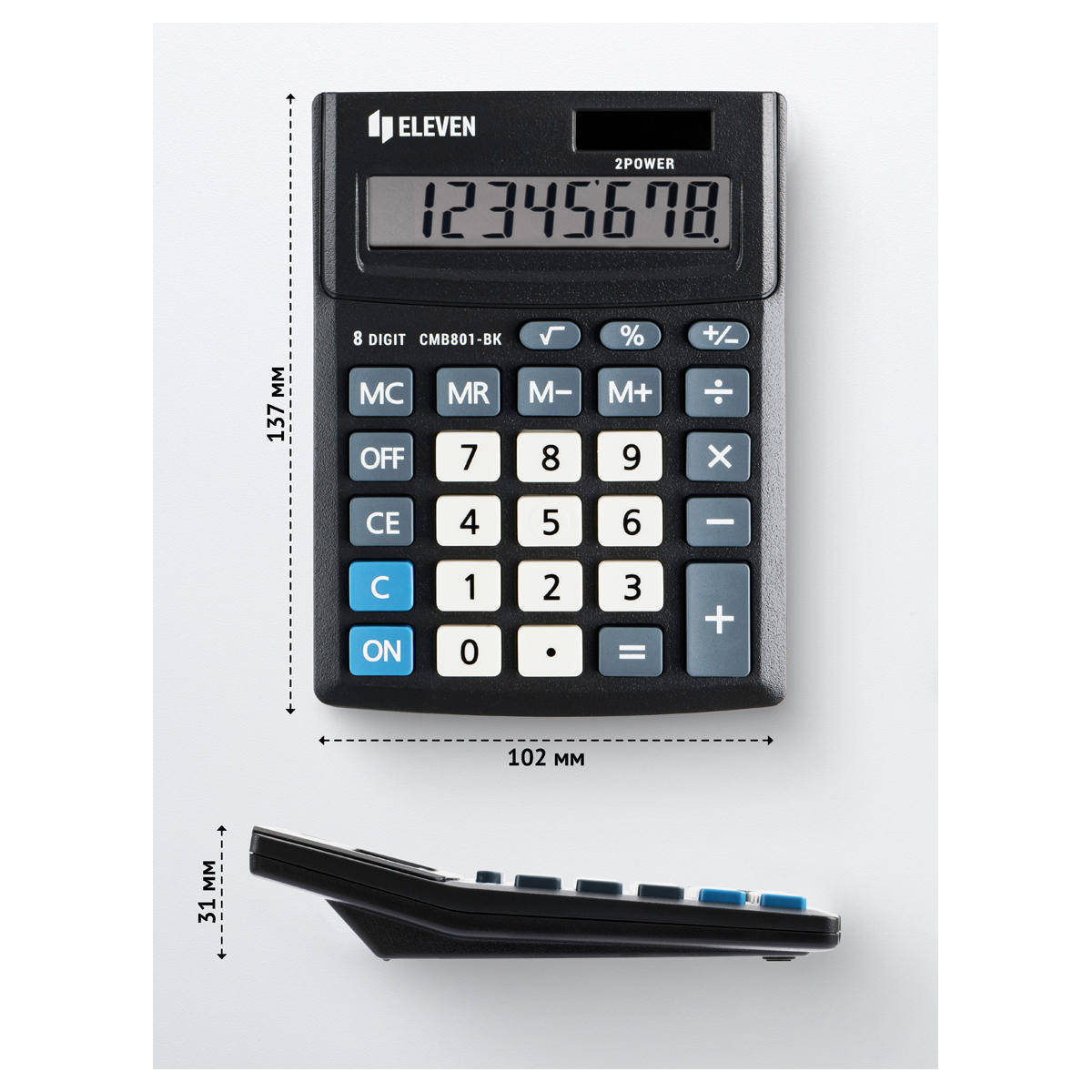 Calculator cu 8 cifre Eleven CMB801BK este un dispozitiv simplu si compact conceput pentru calcule de baza rapide. Setul optim de functii va ajuta la automatizarea calculelor: calcul radacina patrata, functie de schimbare a semnului. Alimentarea dubla (solara + baterie AG10, LR1130, LR54) si oprirea automata cresc durata de viata a calculatorului. Dimensiune � 137x102x3mm, greutate � 90 g, culoare � negru.