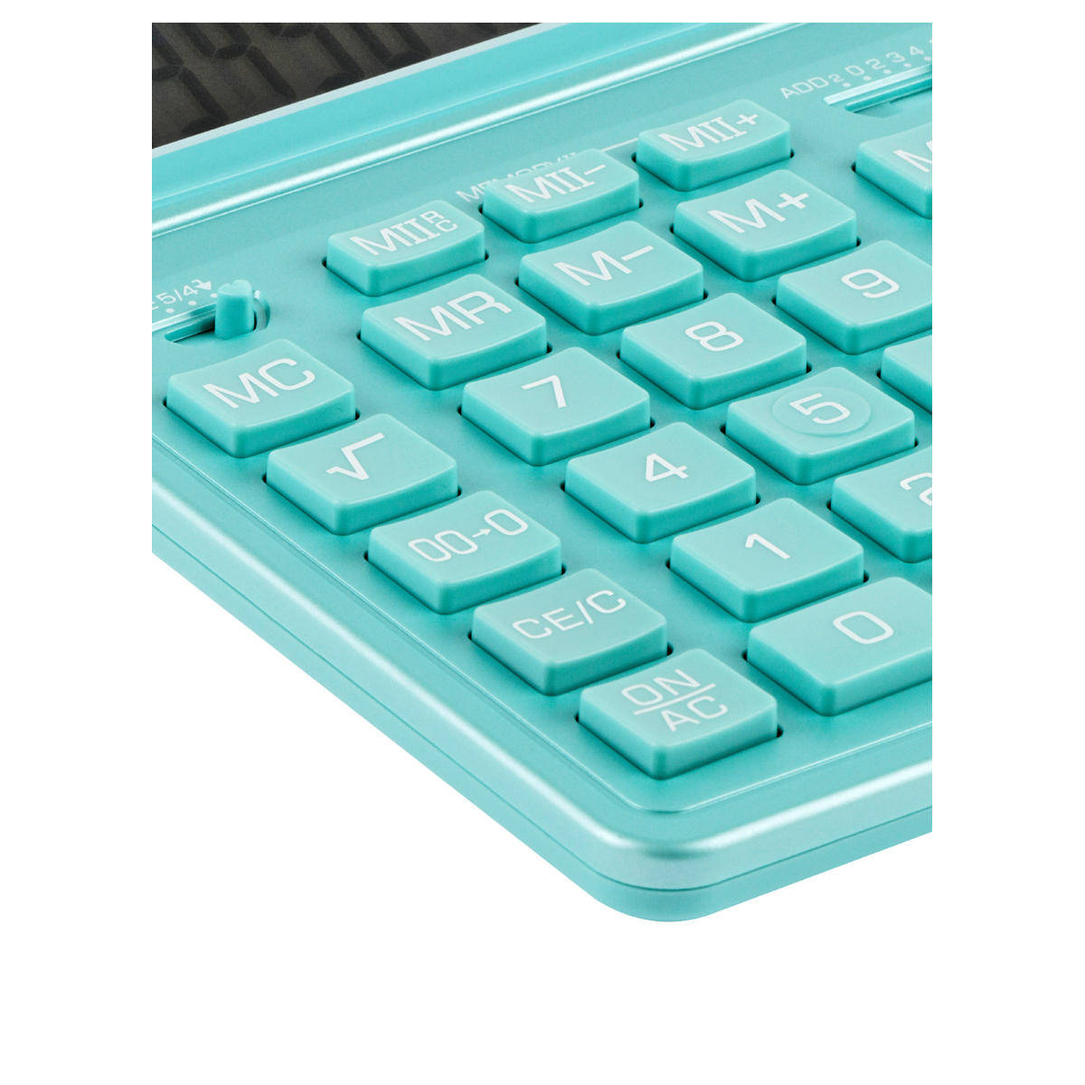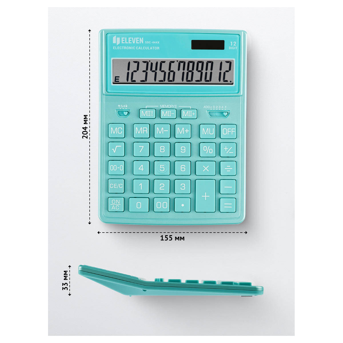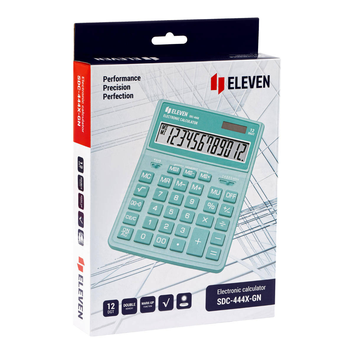 Calculator cu 12 cifre Eleven SDC444XGN este un asistent indispensabil la birou, la scoala si acasa. Un set optim de functii va ajuta la automatizarea calculelor: calcul radacina patrata, corectare a ultimei valori introduse, buton �00� si �000�, memorie dubla, calcul de adaos. Alimentare dubla (solar + baterie AG10, LR1130, LR54) si oprirea automata. Dimensiunea calculatorului 204x155x33mm. Culoare turcoaz.