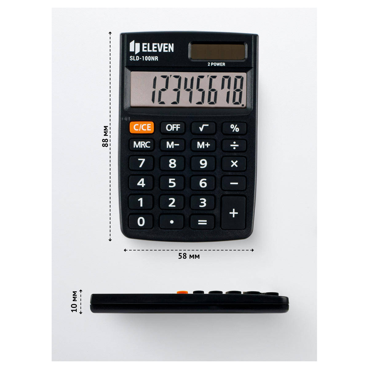 Calculatorul de buzunar cu 8 cifre Eleven SLD-100NR este conceput pentru a efectua operatii aritmetice. Functiile de baza va vor ajuta sa faceti calcule simple, sa calculati radacini patrate si procente si sa efectuati operatii de memorie. Sursa de alimentare dubla (solara + baterie AG10, LR1130, LR54) si oprirea automata cresc durata de viata. Dimensiunea calculatorului � 88x58x10 mm, greutate � 37 g, culoare � negru.