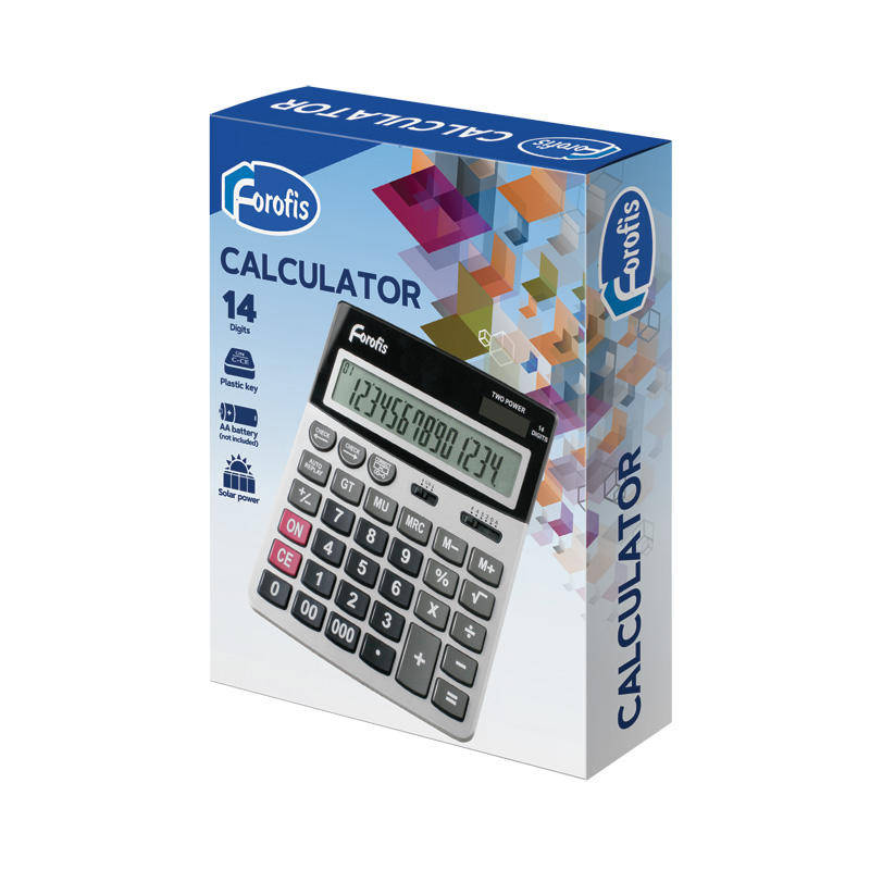 Calculatorul Forofis cu 14 cifre este conceput pentru a efectua operatii aritmetice. Un set optim de functii va ajuta la automatizarea calculelor: calcul radacina patrata, functie de schimbare a semnului. Alimentarea dubla si oprirea automata maresc durata de viata a calculatorului. Dimensiune calculator � 186x152x27 mm, culoare � sur. Amabalat in cutie de carton.