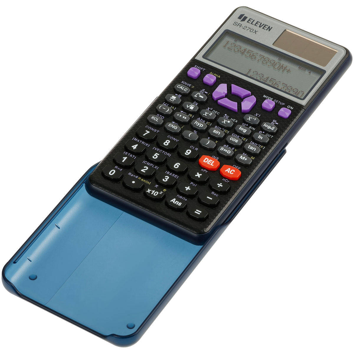 Calculator stiintific din seria Eleven SR-270N. Display cu afisare: 4 linii, matrice de puncte. 417 functii stiintifice vor face invatarea interesanta si captivanta. Alimentarea dubla (solara + baterie LR44) si oprirea automata maresc durata de viata a calculatorului. Husa dura va proteja calculatorul de deteriorare. Dimensiune � 81x165x16 mm, greutate � 125 g, culoare � negru.