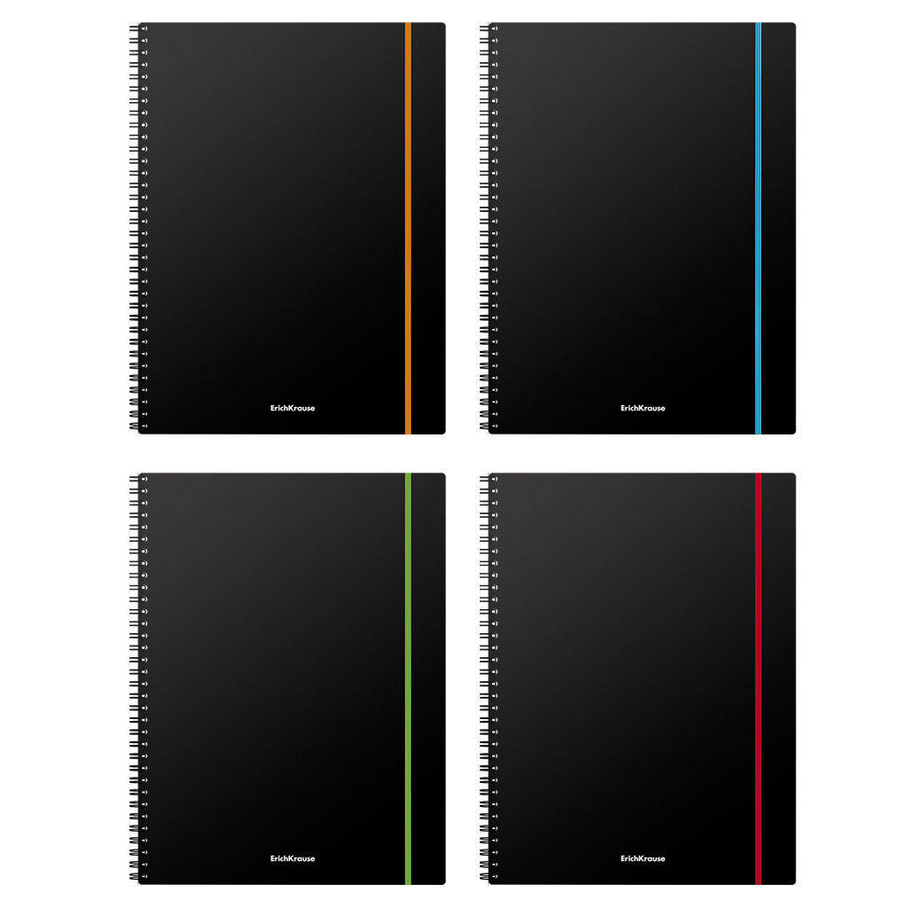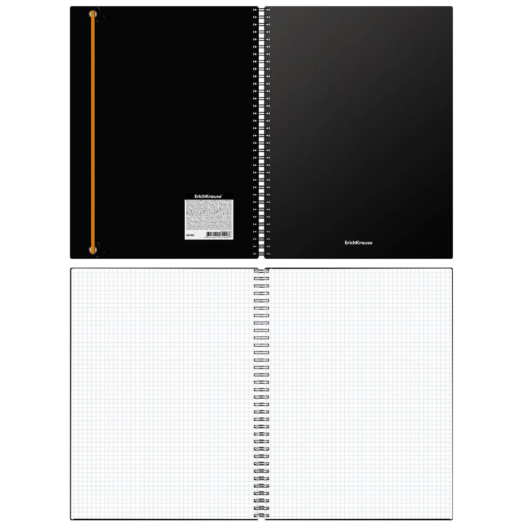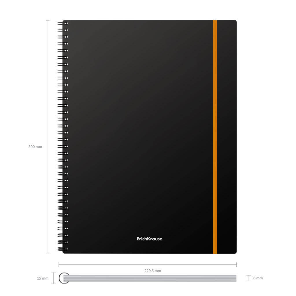 Registru ErichKrause Accent format A4 (210x297 mm). Coperta este realizata din plastic mat de calitate inalta, rezistenta la uzura, cu o textura tip nisip. Coperta este de culoare neagra. Dispune de colturi rotunjite si banda elastica rezistenta de culori asortate. Blocul contine 80 de foi in patratele. Hartie offset cu o densitate de 60 g/m2. Culoarea linierii este albastru. Tip de prindere - spirala.