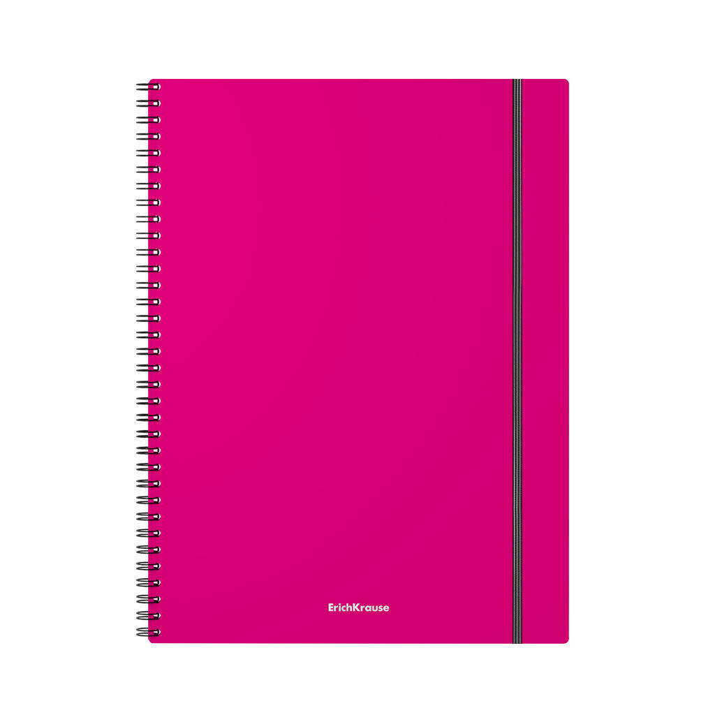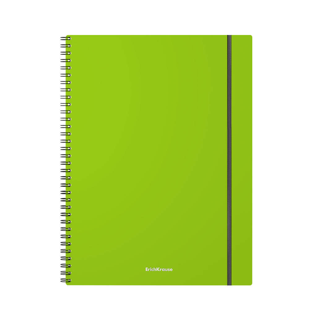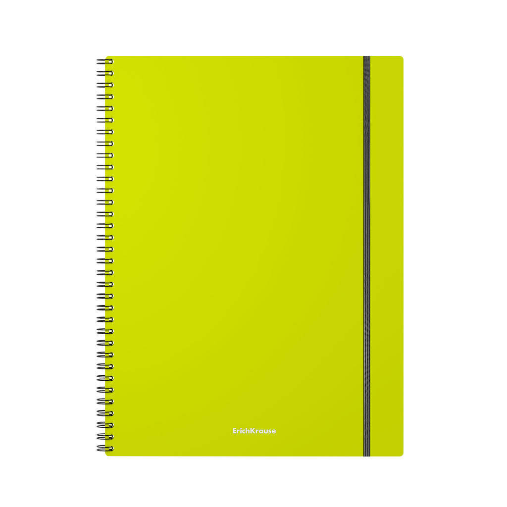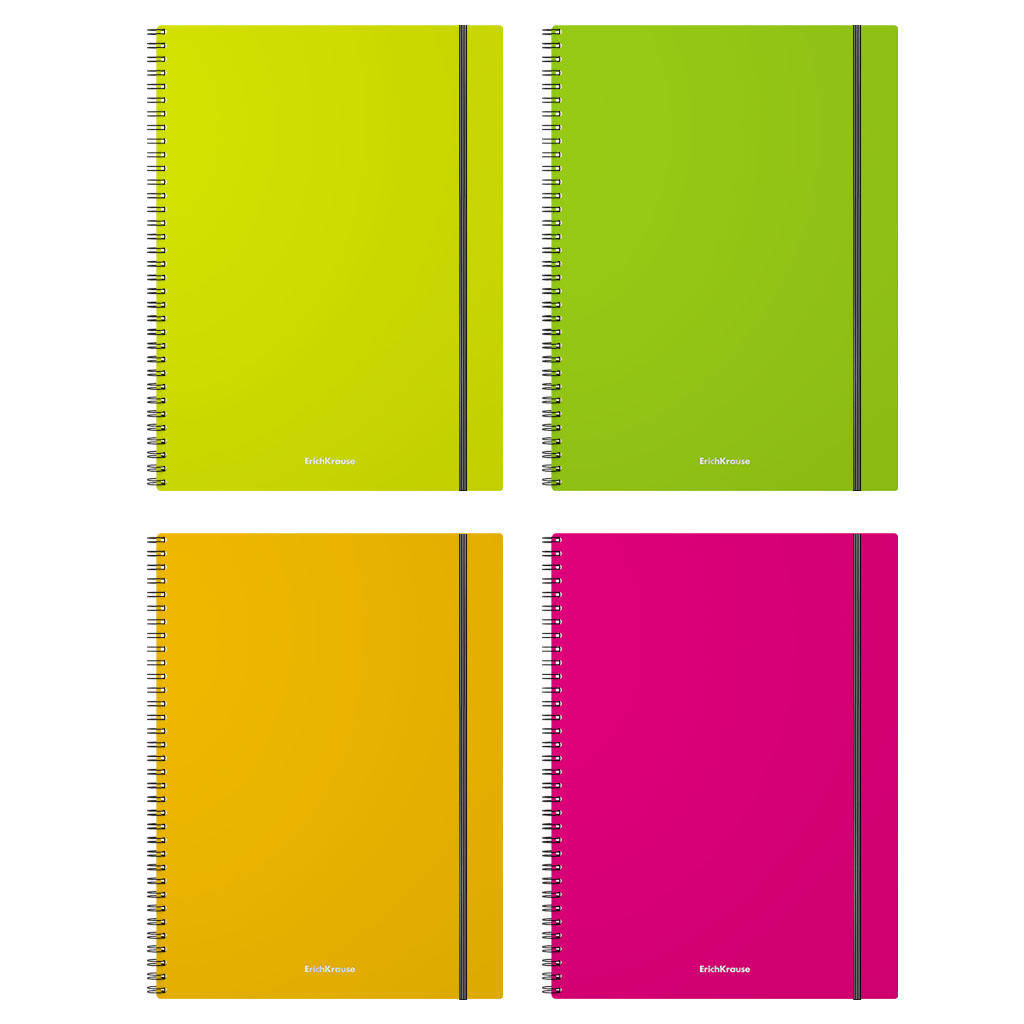 Registru ErichKrause Neon format A4 (210x297 mm). Coperta este realizata din plastic mat de calitate inalta, rezistenta la uzura, cu o textura tip nisip. Coperta dispune de culori neon, asortate si colturi rotunjite. Blocul contine 80 de foi in patratele. Hartie offset cu o densitate de 60 g/m2. Culoarea linierii este albastru. Coperta este asigurata cu o banda elastica rezistenta. Tip de prindere - spirala.