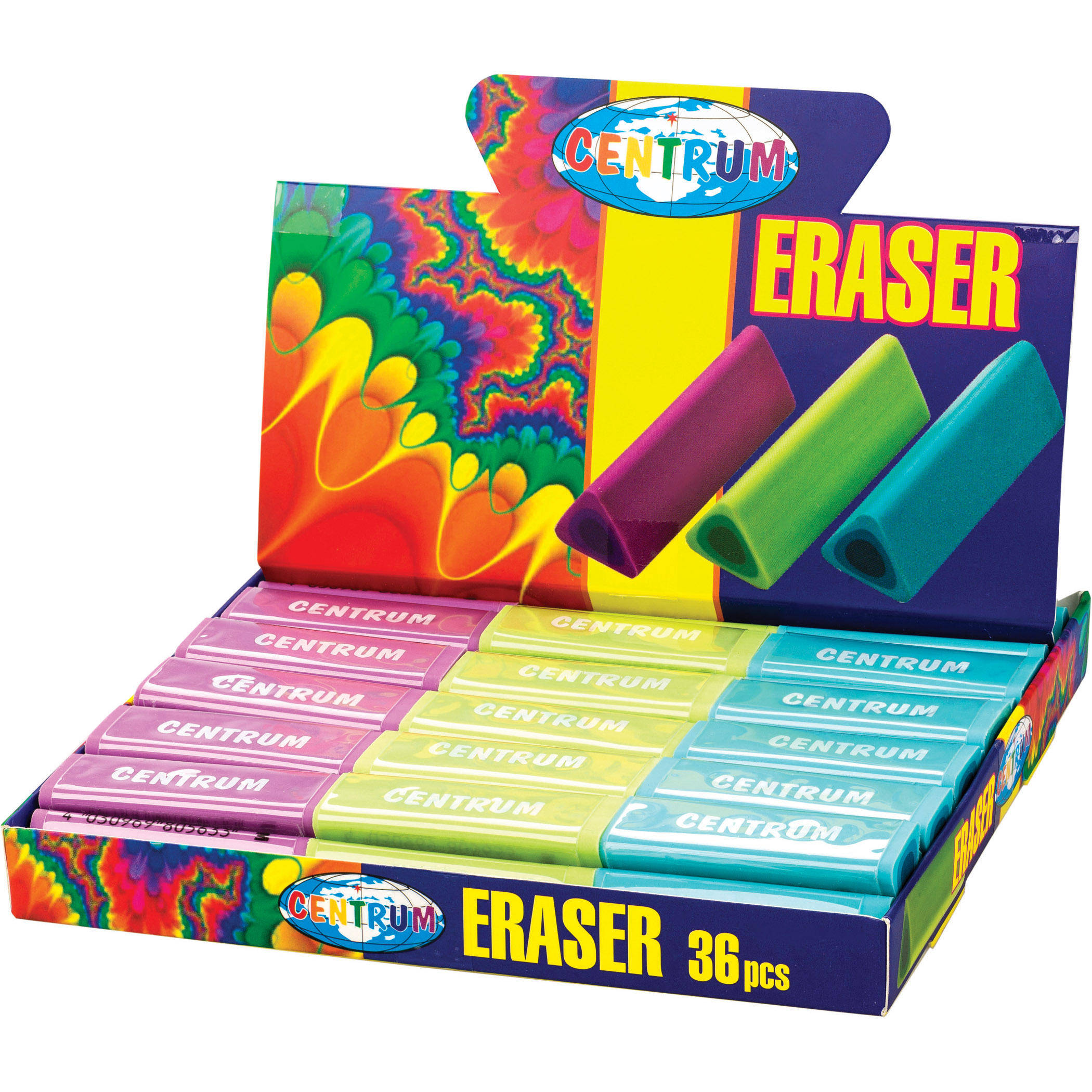 Radiera Centrum este fabricata din cauciuc sintetic. Ideal pentru stergerea liniilor lasate de creioane. Are o forma triunghiulara ergonomica. Trei culori asortate. Fiecare radiera este impachetata intr-un ambalaj individual. Dimensiune 45x16x16 mm. Ambalare: cutie de carton a cate 36 bucati.