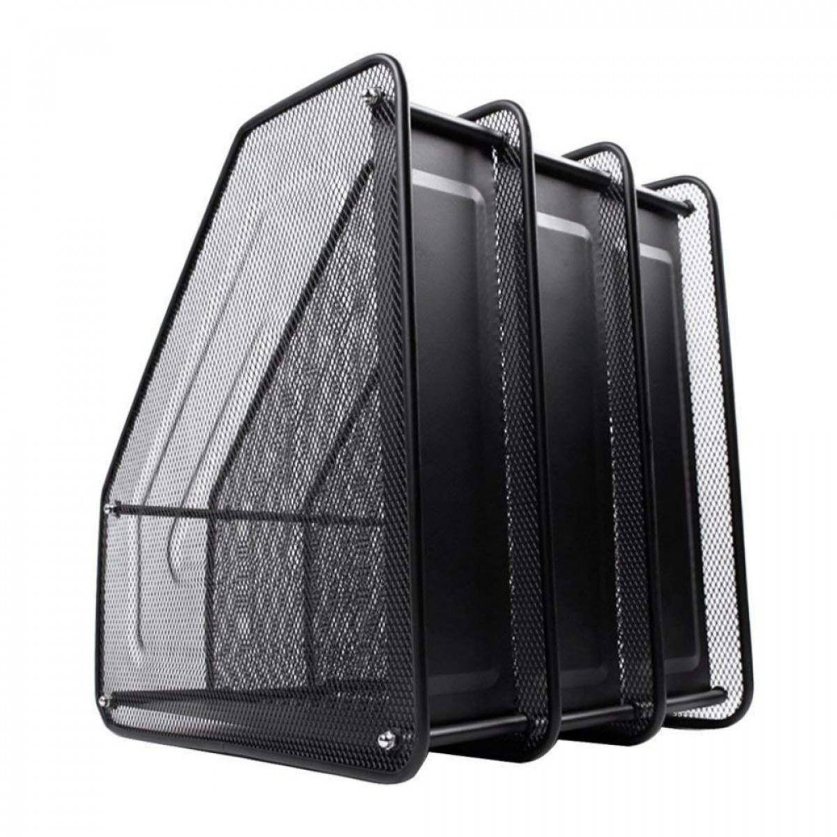 Suport pentru documente vertical cu trei sectii va stoca in mod compact documentatia, brosurile, cataloagele si alte produse de dimensiune A4. Mecanismul retractabil ofera acces usor la continutul tavilor. Fabricat din plasa metalica durabila de inalta calitate. Realizat in culoare neagra clasica. Ambalat intr-o cutie individuala cu o instructiune de asamblare. Furnizat intr-o forma compacta dezasamblata.