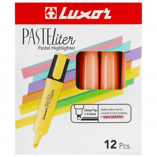 Marker text LUXOR PASTEL, de culoare portocaliu, pe baza de apa. Grosimea liniei de scris 1-4,5 mm, varf tesit. Capac cu clema. Markerul este ideal pentru toate tipurile de hartie. Cantitate in cutie: 12 bucati.