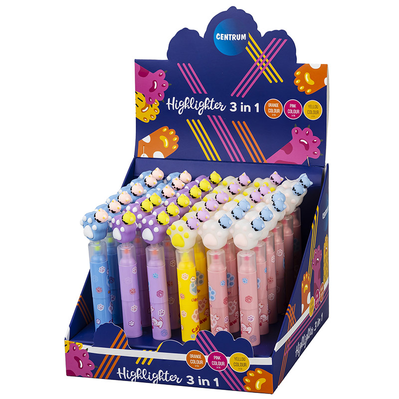 Cu noul evidentiator 3 in 1 CAT PAW de la Centrum, acum ai toate culorile la indemana! Pur si simplu rearanjeaza fiecare segment pentru a gasi culoarea de care ai nevoie. Markerul are trei segmente cu culori diferite. Disponibil in nuante neon vibrante. Varful inclinat masoara 1-4 mm. Culorile cernelii includ roz, galben si portocaliu. Corpul rotund din plastic este completat de o figurina cauciucata. Este disponibila o varietate de modele de corp.