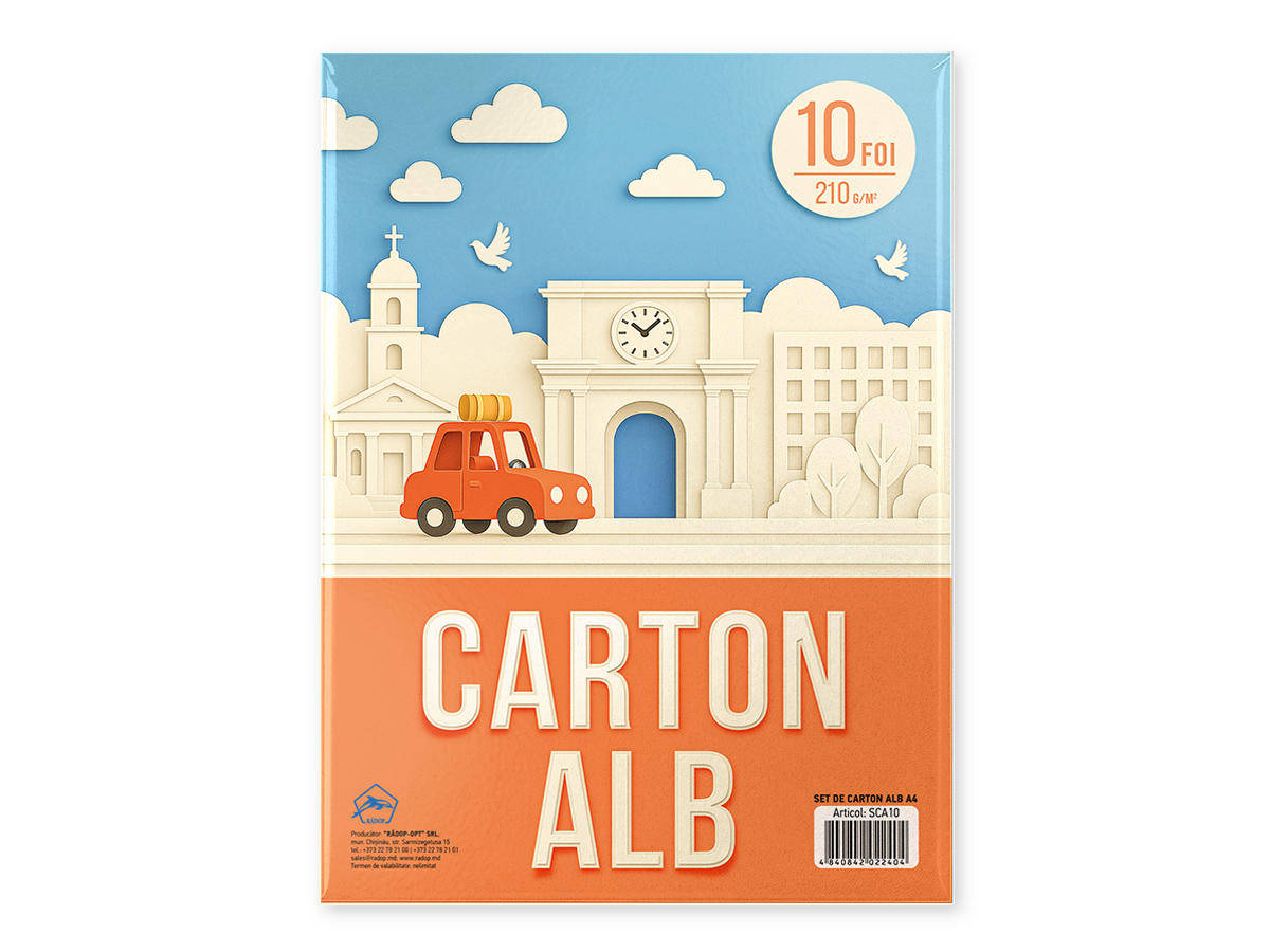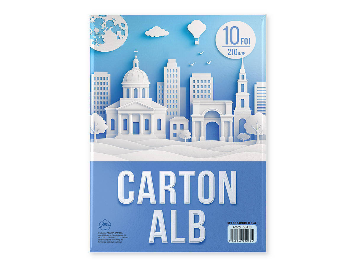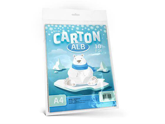 Set carton alb este destinat pentru creativitatea copiilor. Cu ajutorul cartonului alb, un copil va putea crea aplicatii incintatoare. Densitatea cartonului A4 este de 210 g/m2. Setul contine 10 foi. Cartonul este ambalat intr-o mapa de carton cu grosimea de 150 gr/m2 si un blister cu umeras Euro. Cantitate in ambalaj 20 bucati.