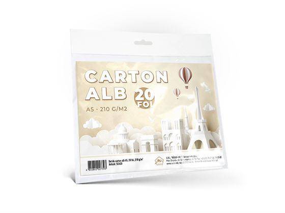Set carton alb este destinat pentru creativitatea copiilor. Cu ajutorul cartonului alb, un copil va putea crea aplicatii incintatoare. Densitatea cartonului A5 este de 210 g/m2. Setul contine 20 foi. Cartonul este ambalat intr-o mapa de carton cu grosimea de 150 gr/m2 si un blister cu umeras Euro. Cantitate in ambalaj 40 bucati.