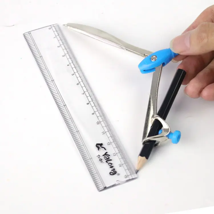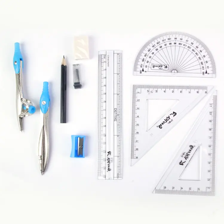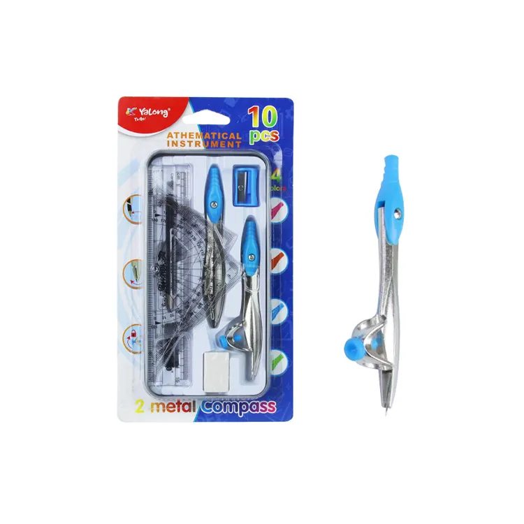 Set instrumente pentru desen liniar Yalong, 10 piese. Setul contine :rigla 15 cm, echer 2 bucati, raportor, compas standard, compas pentru creion, creion simplu HB, radiera, mine rezerva pentru compas, ascutitoare. Material metal+plastic. Culoare asortat, 4 culori.