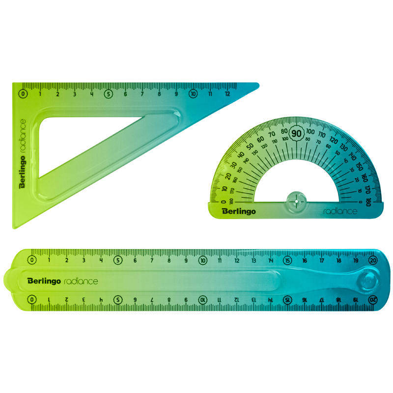 Setul de desen Radiance Berlingo este realizat din plastic de inalta rezistenta si nu se va rupe atunci cand este indoit. Design luminos in stil gradient. Setul include: rigla 20 cm, triunghi 30, 14 cm si raportor 10 cm, 180.