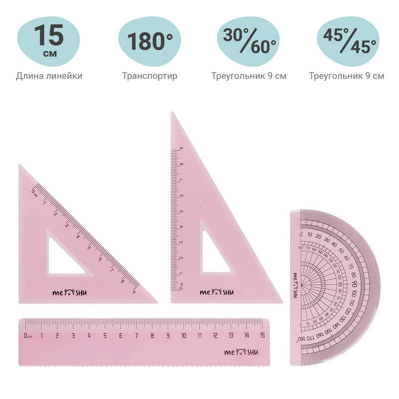Setul de desene mic MESHU Beary Beary include: o rigla de 15 cm lungime, doua triunghiuri 30/60, 45/45 si un raportor. Riglele din plastic transparent sunt realizate intr-o culoare delicata de roz. O husa din PVC in modelele dragute ale lui MESHU nu numai ca va va oferi usurinta in depozitare si utilizare, dar va va oferi si o dispozitie grozava.