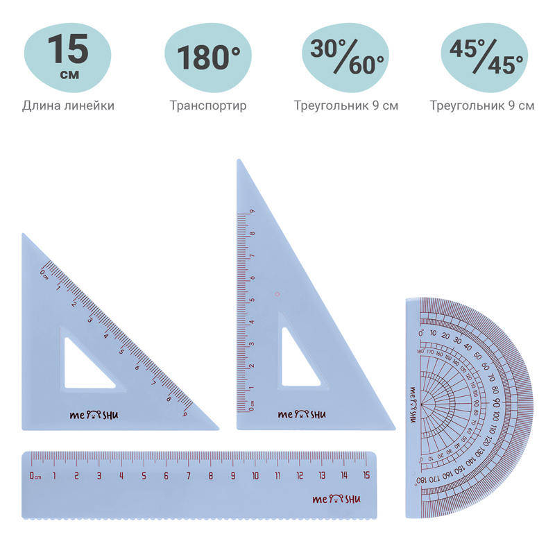 Setul de desene mic MESHU Beary Beary include: o rigla de 15 cm lungime, doua triunghiuri 30/60, 45/45 si un raportor. Riglele din plastic transparent sunt realizate intr-o culoare delicata de albastru deschis. O husa din PVC in modelele dragute ale lui MESHU nu numai ca va va oferi usurinta in depozitare si utilizare, dar va va oferi si o dispozitie grozava.