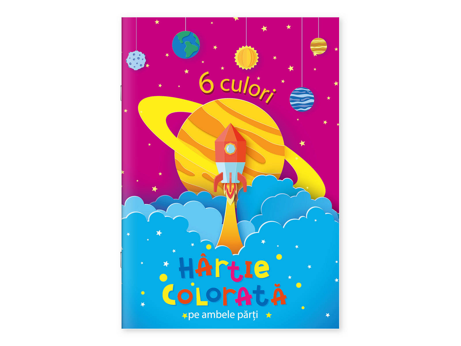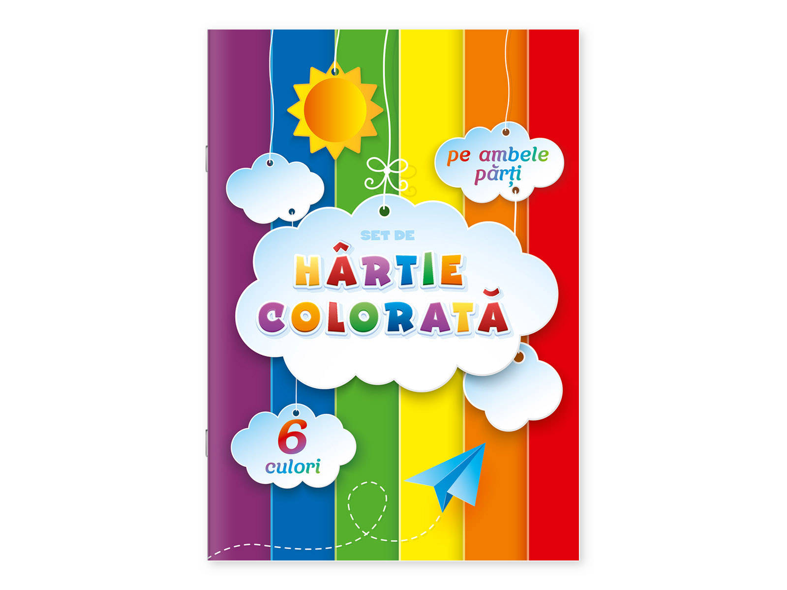 Set hartie color pe 2 parti este destinat pentru creativitatea copiilor. Cu ajutorul hartiei colorate, un copil va putea crea aplicatii incintatoare. Densitatea hartiei ofset A4 este de 80 g/m2. Setul contine 6 culori pe 6 foi. Hartia este ambalata intr-o mapa de carton cu grosimea de 150 gr/m2. Cantitate in ambalaj 50 bucati