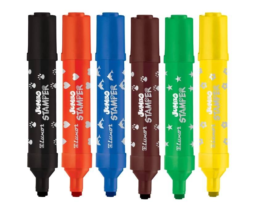 Carioci Luxor Jumbo Stamper au stampile atractive. Setul contine 6 culori: albastru, negru, galben, cafeniu, verde. portocaliu. Markerele sunt ambalate intr-o cutie de carton. Setul contine 6 markere colorate cu varfuri de stampila cu diferite imagini care iti vor face desenele mai atractive. Cariocile ajuta la dezvoltarea creativitatii si a imaginatiei. Markere Luxor sunt special concepute pentru copiii cu varsta de 3 ani si mai mult. Au corpul ingrosat si o structura speciala a unitatii de scris, care nu se deformeaza la apasare ferma. Cerneala pe baza de apa poate fi indepartata cu usurinta de pe ?mbracaminte. Carioci Luxor sunt prezentate cu un capac sigur, ventilat, care este usor de indepartat si pus.