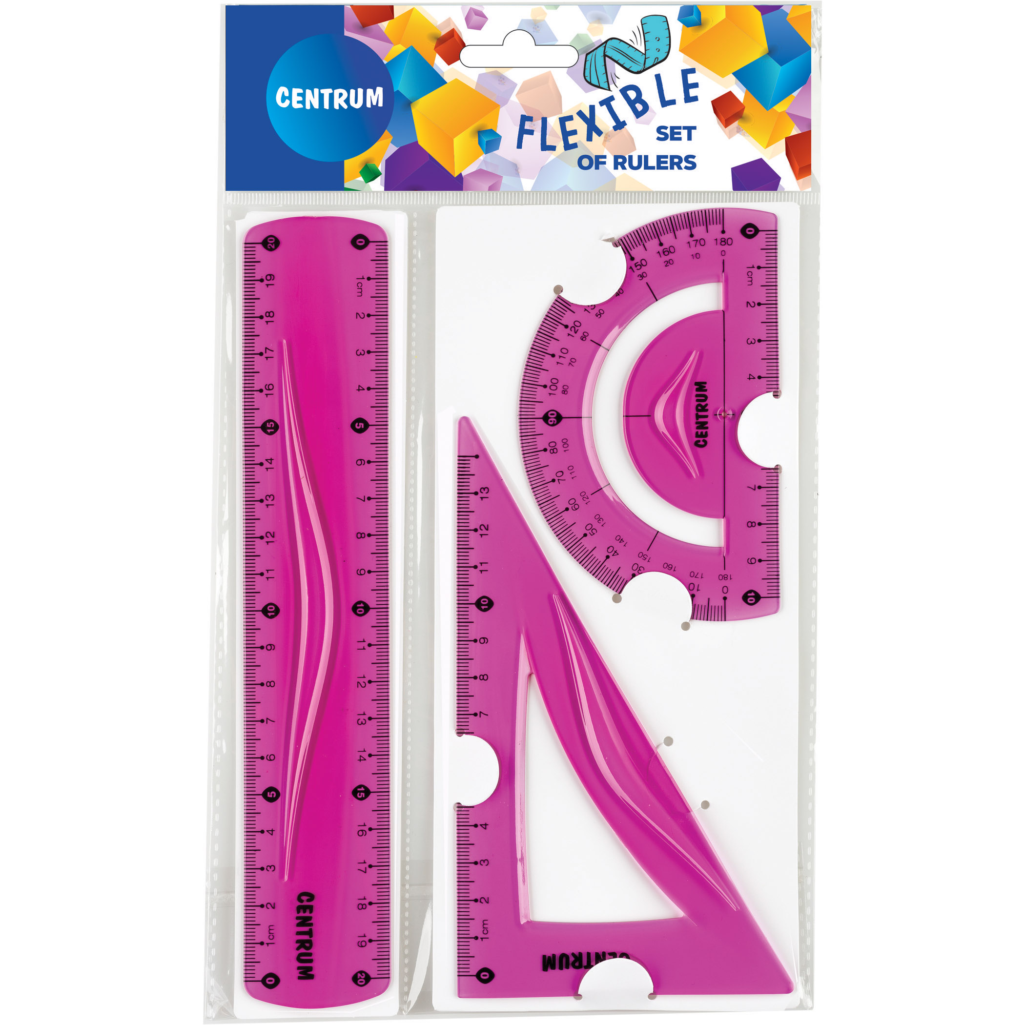 Setul este realizat din plastic flexibil, non-toxic. Marcajele de scara sunt imprimate cu vopsea neagra rezistenta la abraziune, care asigura o durata lunga de viata a produsului. Setul include: rigla de 20 cm, echer, raportor. Culoare asortat: roz, albastru, galben.