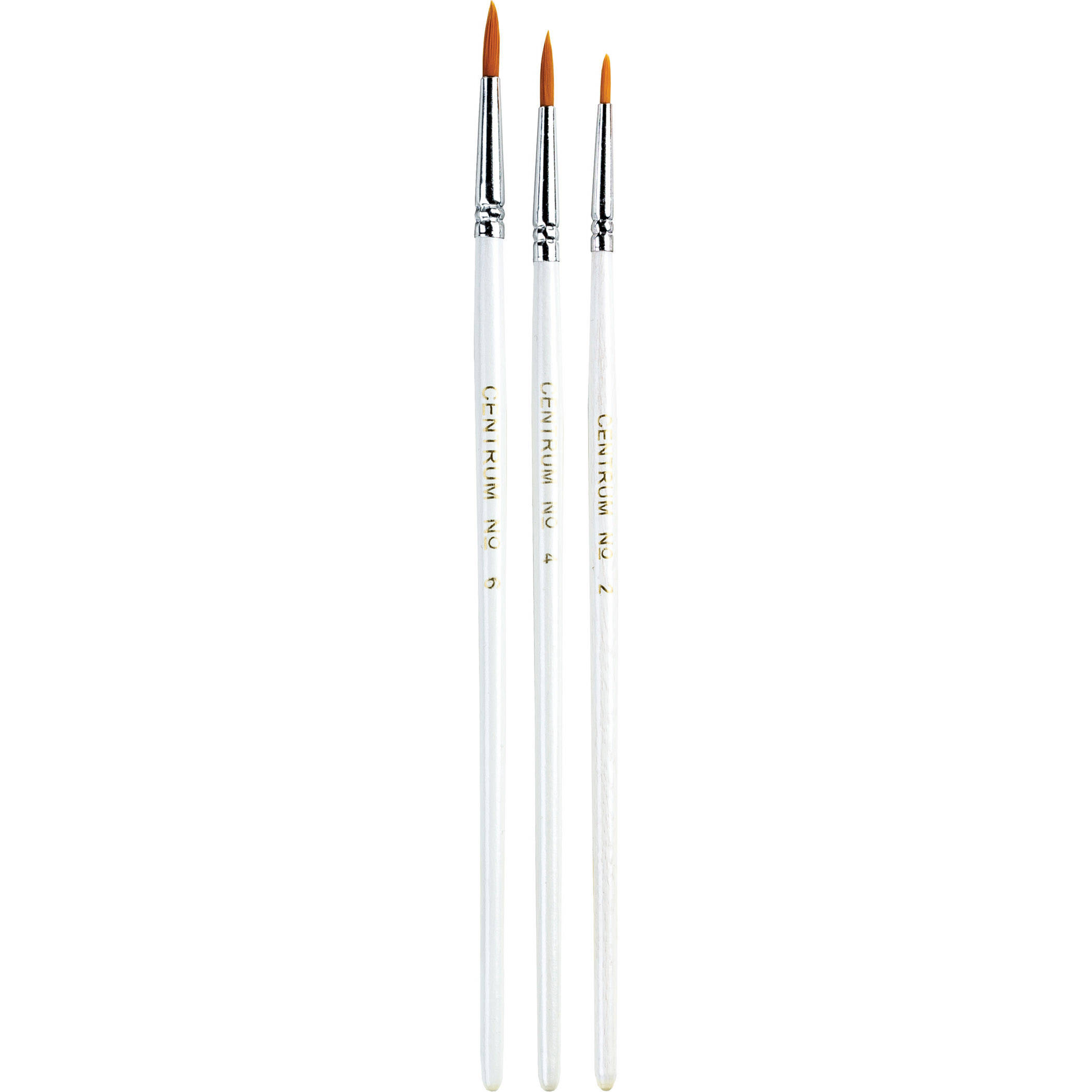 Setul de pensule pentru arta Centrum este fabricat din nailon de inalta calitate. Pensulele absorb, tin si elibereaza bine vopseaua. Produsele sunt potrivite pentru lucrul cu acuarele, guasa, tempera si materiale hidro-polimer. Forma pensulei este conus. Materialul manerului este din plastic. Culoare maner pensula alb. Setul contine 3 piese: Nr.2,4,6. Produsul este ambalat intr-un blister cu umeras Euro.