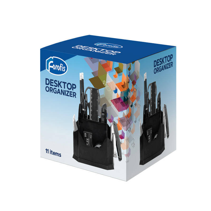 Setul de papetarie de birou este realizat din plastic negru. O solutie excelenta pentru masa de oficiu. Suportul ocupa spatiu minim si detine toate rechizitele de birou necesare pentru lucru. Are o baza rotativa la 360 de grade. Echipament: capsator Nr10, capse Nr10, foarfece, cutter, pix, 2 creioane simple, ascutitoare, radiera, rigla, pioneze si clame. In total sunt 11 articole.