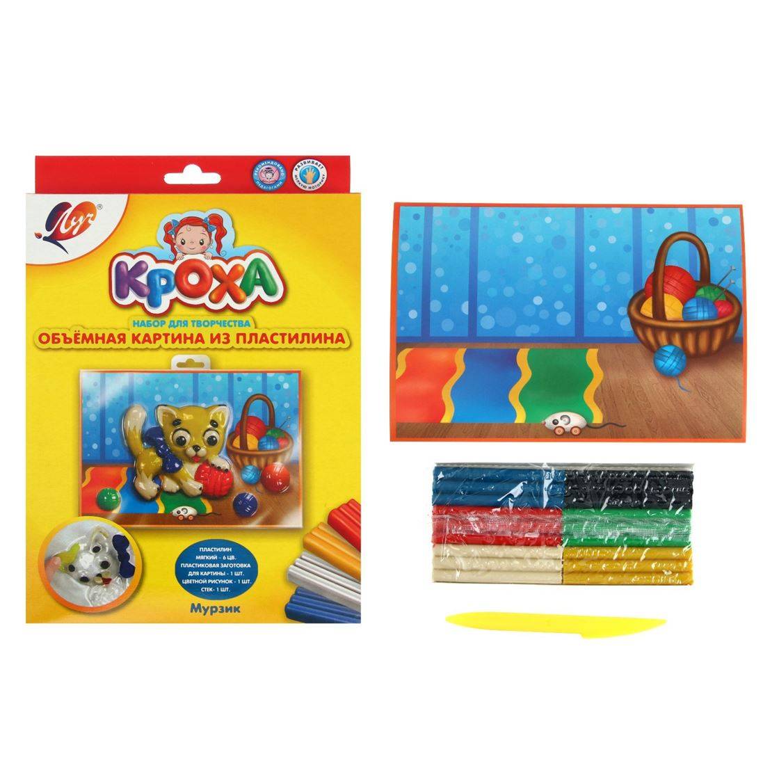 Setul Pictura tridimensionala din plastilina: Pisica este prezentat in seria de materiale Kroha pentru copii. Conceput pentru a crea o imagine tridimensionala din plastilina folosind un semifabricat din plastic. Continut: plastilina moale de ceara in 2 culori, care nu necesita framantare prealabila si este ideala pentru degetele copiilor, model voluminos de plastic cu relief, model de fundal colorat, ochi miscatori de plastic.