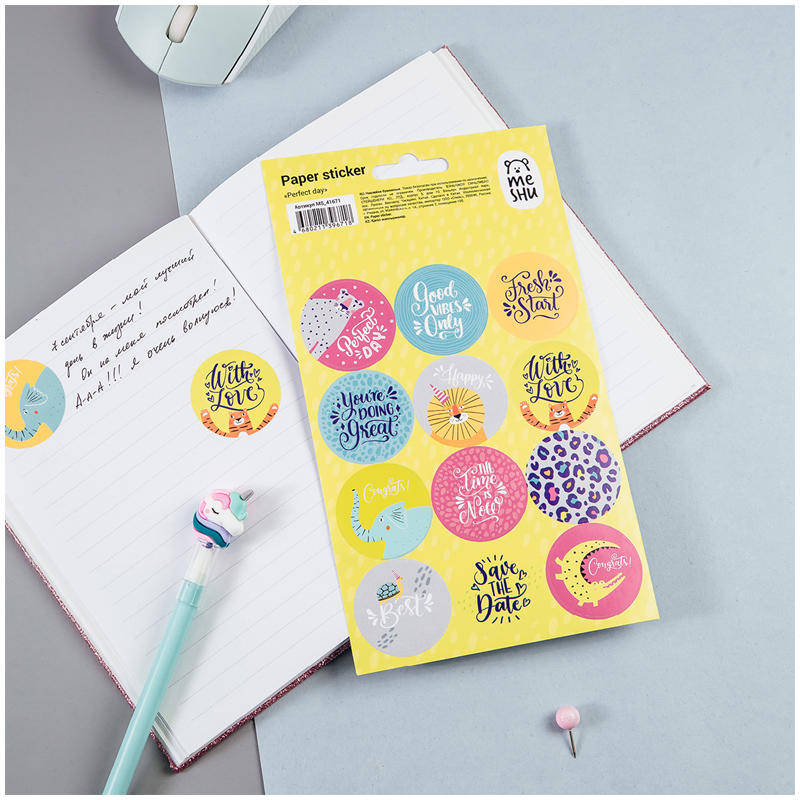 Seturile de autocolante din hartie MESHU Perfect day sunt ideale pentru a proiecta note, felicitari, mestesuguri, precum si pentru decorarea articolelor de papetarie, telefoane, laptopuri si articole de interior. Setul este format din 1 foi cu dimensiunile 210*120 mm si include 12 autocolante. Designurile moderne si stralucitoare vor face procesul creativ distractiv si va vor oferi o stare de spirit grozava.