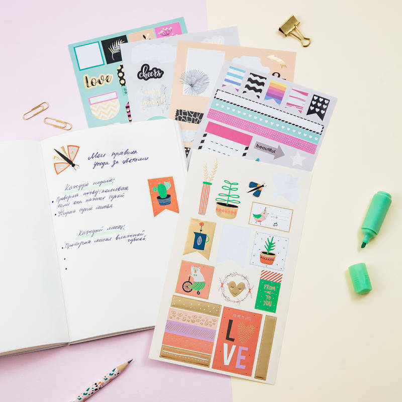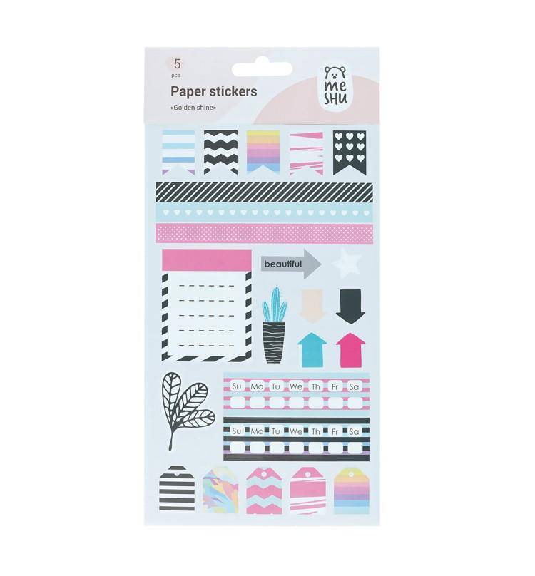 Seturile de autocolante din hartie MESHU Golden shine sunt ideale pentru a proiecta note, felicitari, mestesuguri, precum si pentru decorarea articolelor de papetarie, telefoane, laptopuri si articole de interior. Setul este format din 5 foi cu dimensiunile 210*120 mm si include 150-200 autocolante. Designurile moderne si stralucitoare vor face procesul creativ distractiv si va vor oferi o stare de spirit grozava.