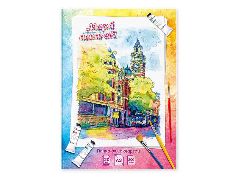 Mapa pentru acuarela din carton stratificat cu un bloc intern de hartie offset, densitate 200 gr/m2, este perfect pentru desenarea cu vopsele, creioane, carioci, pixuri si creta. Mapa este formata din 20 de foi, dimensiune: 297x420 mm si format A3. Amabalaj 10 bucati.