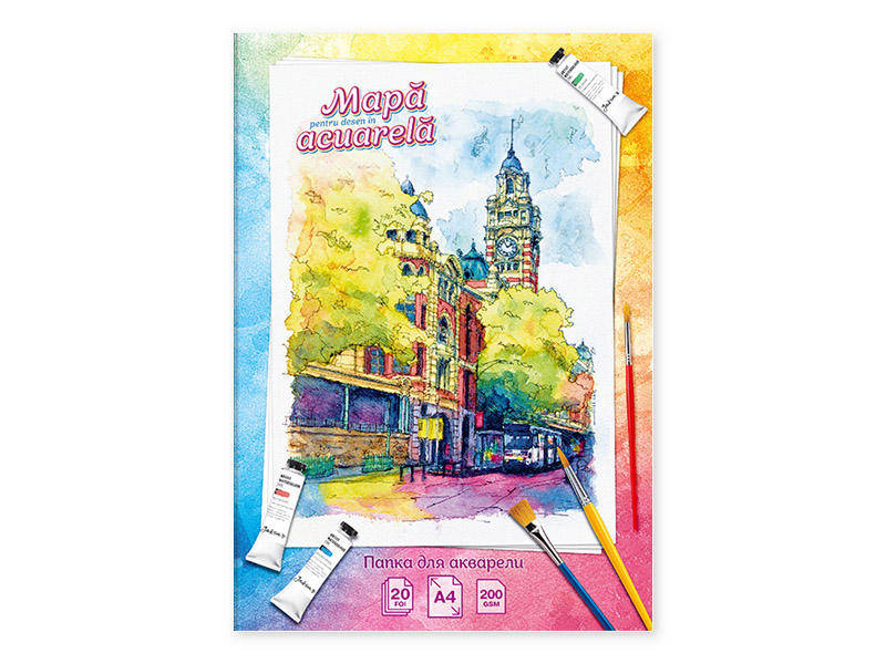 Mapa pentru acuarela din carton stratificat cu un bloc intern de hartie offset, densitate 200 gr/m2, este perfect pentru desenarea cu vopsele, creioane, carioci, pixuri si creta. Mapa este formata din 20 de foi, dimensiune: 210x297 mm si format A4.