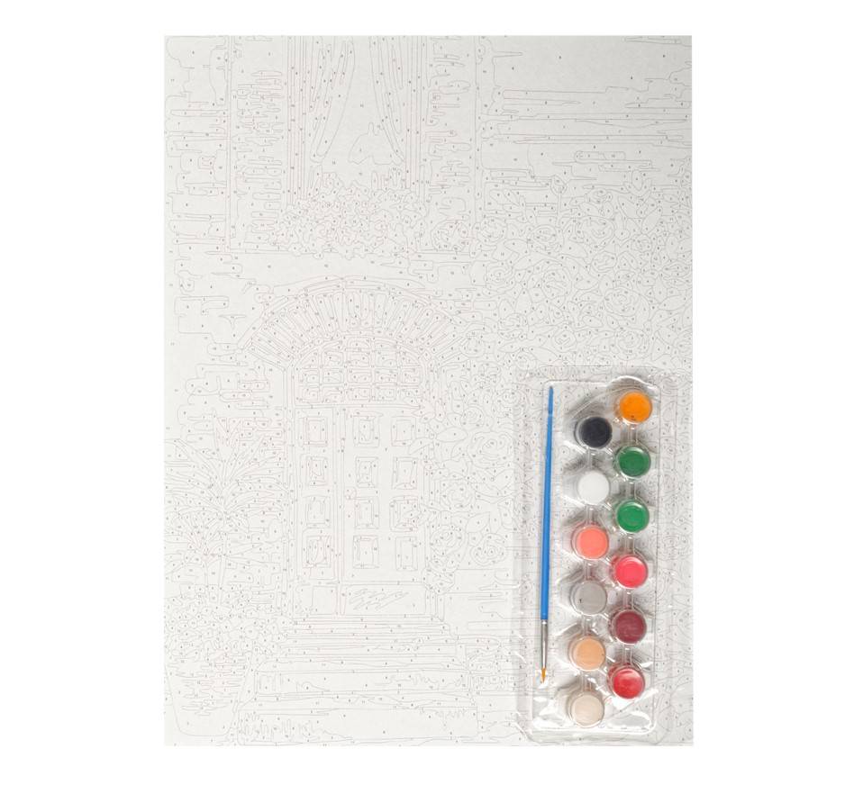 Setul include o baza de carton conturata cu dimensiunile de 29,5*39,5, numerotata in functie de culoarea vopselei. Pentru pictura sa sunt destinate vopsele acrilice (12 bucati) si o pensula de nailon (1 bucata). Puteti face o mostra de proba pe o foaie de maculator.