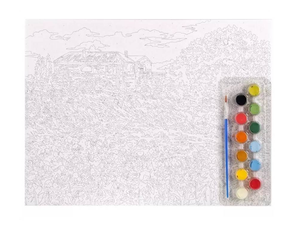Setul include o baza de carton conturata cu dimensiunile de 29,5*39,5, numerotata in functie de culoarea vopselei. Pentru pictura sa sunt destinate vopsele acrilice (12 bucati) si o pensula de nailon (1 bucata). Puteti face o mostra de proba pe o foaie de maculator.