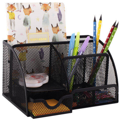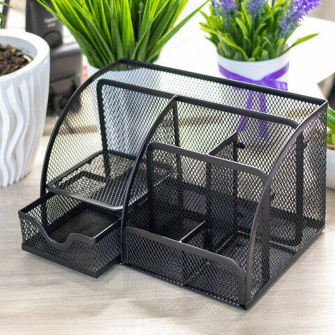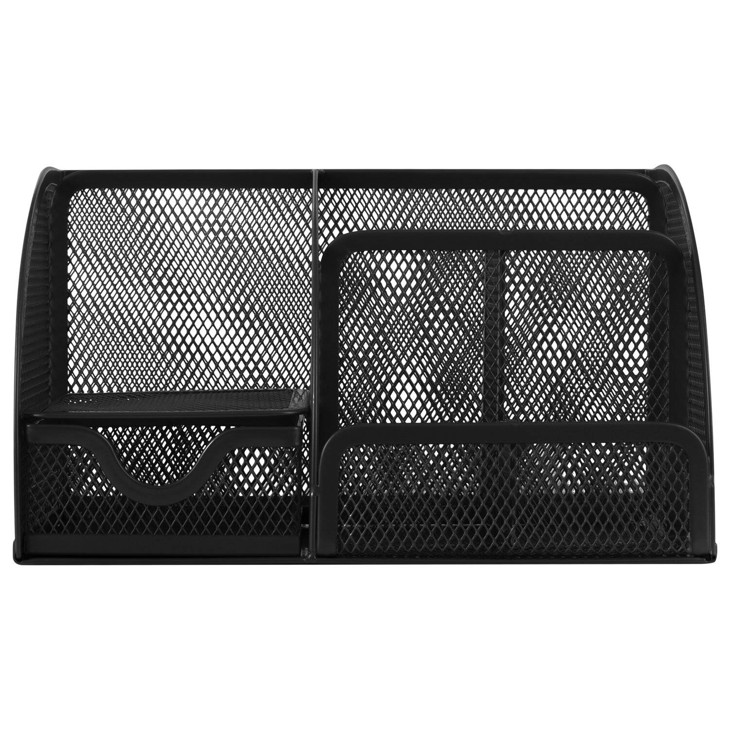 Suport de masa pentru rechizite de birou. Sapte compartimente. Dimensiuni: 125x220x140mm. Material: plasa metalica. Culoare: negru.