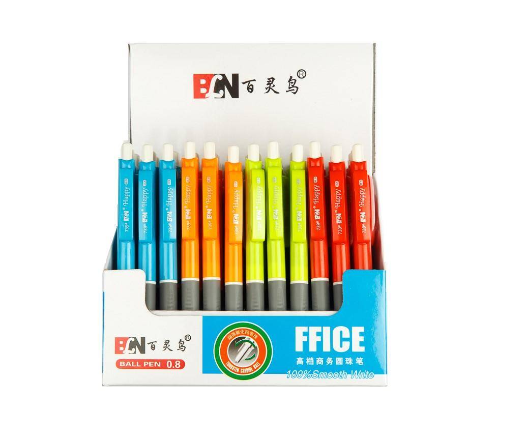 Pix cu bila si mecanism cu cerneala pe baza de ulei. Corp din plastic colorat. Forma corpului rotunda. Grosimea varfului de scris este de 0.8 mm. Are manjeta de cauciuc, de culoare gri. Culoare cerneala albastru. Cantitate in cutie 60 bucati.