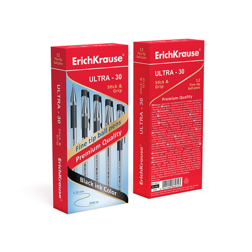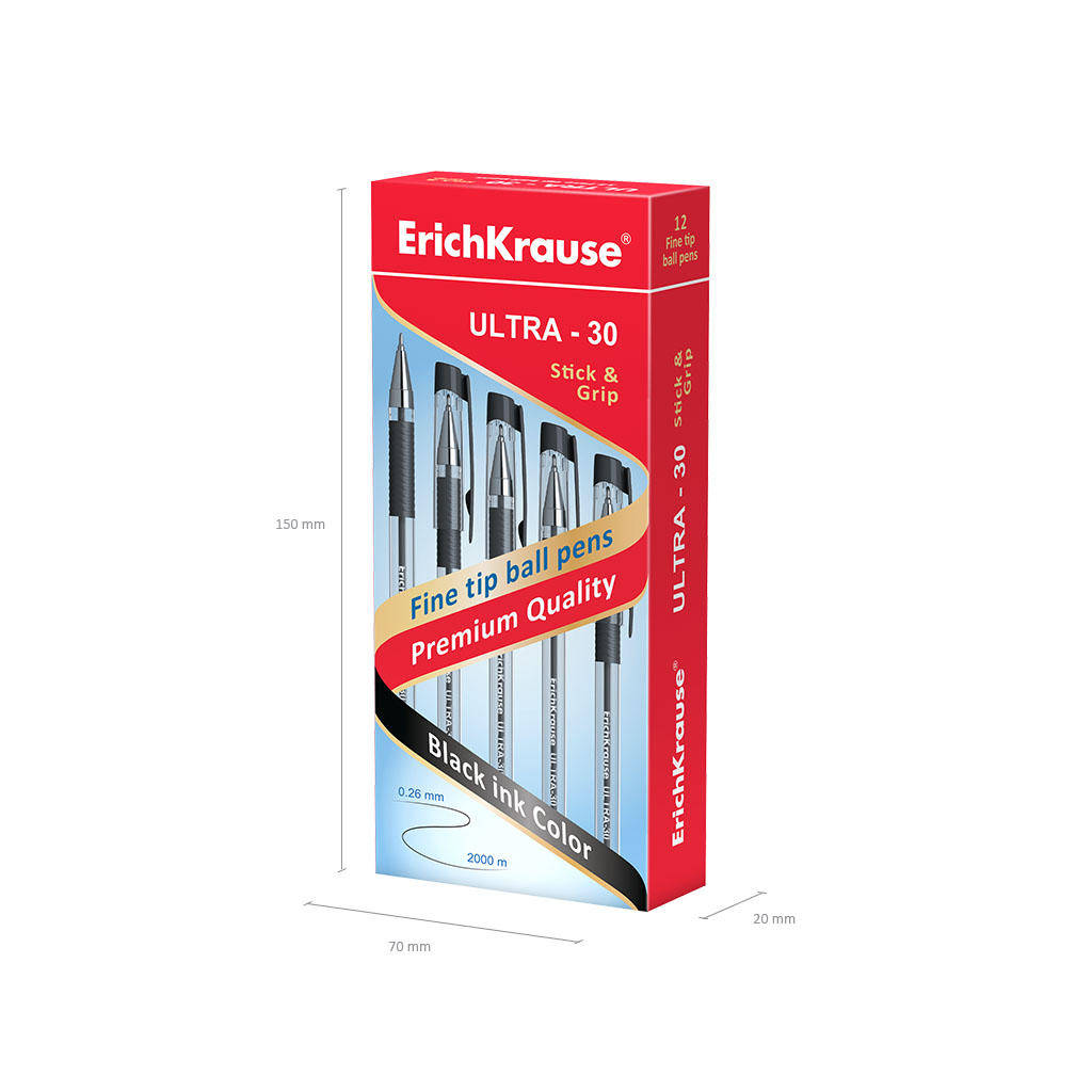Pix cu bila si cerneala pe baza de ulei ErichKrause ULTRA-10 Stick Classic. Pix clasic Stick cu virf metalizat, fin rafinat si reincarcare inlocuibila. Manerul are un corp hexagonal transparent, cu o zona de prindere reliefata confortabila si un capac ventilat. Culoarea capacului si a mufei se potriveste cu culoarea cernelii. Virful cu 5 canale si un diametru de bila de 0,7 mm este combinat cu o cerneala cu vascozitate redusa pentru o scriere precisa si rapida. Lungimea liniei continue este de 2000 m cu o grosime de 0,26 mm, ceea ce reprezinta un indicator ridicat in categoria sa. Culoarea cerneala negru. Cantitate in ambalaj 12 bucati.