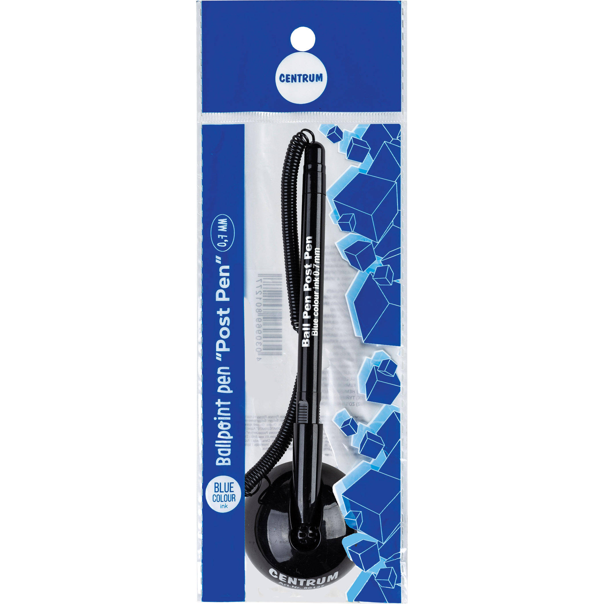 Grosimea liniei 0.7 mm. Culoarea cernelii este albastra. Corpul are o forma rotunda. Culoare corp negru. Ambalat intr-un blister de 1 bucata.