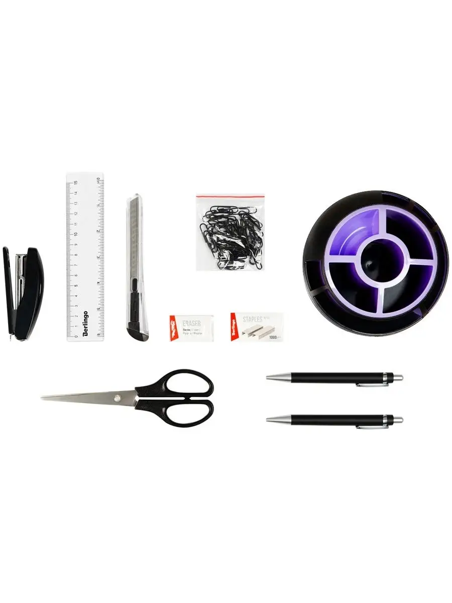 Set de birou Berlingo Instinct cu 10 compartimente combina confortul si estetica. Continutul de inalta calitate al organizatorului este evidentiat de o combinatie de lavanda si negru minimalist. Plasticul primar de inalta calitate, cele 10 compartimente si rotirea la 360 de grade permit accesul convenabil din orice pozitie. Acest organizator de birou include un creion mecanic, un pix retractabil, un capsator, o foarfeca, un cutter, o rigla, clame, o radiera si capse.