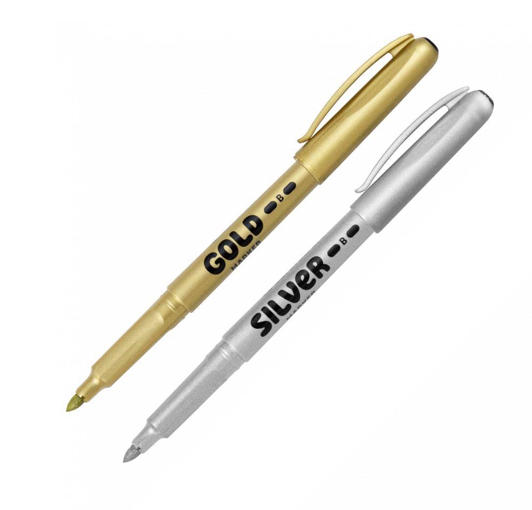 Set markere permanente universale, culoare aurie si argintie. Zona de prindere ergonomica. Stabil pe suprafete poroase, ideal pentru decor. Cerneala rezistenta la lumina. Varf rotund. Diametrul liniei de scris 1,5-3 mm. Diametru corpului 11 mm. Forma corpului este rotunda/triunghiulara.