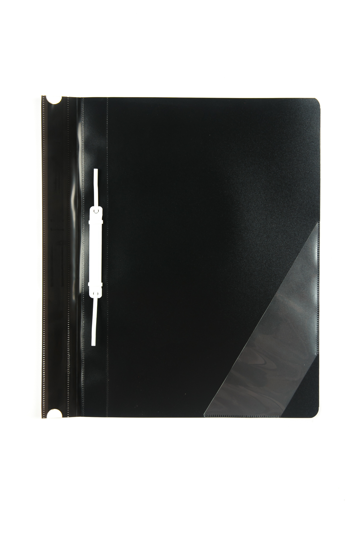 Mapa din plastic cu sina, format A4 cu coperta superiora transparenta colorata din plastic moale 150 microni, a doua coperta este din plastic moale opac 300 microni. Culoarea este negru. Mapa este din polipropilena de inalta calitate, proiectat pentru depozitarea documentelor perforate cu un perforator. Mapa dispune de o eticheta pe cotor pentru marcare. Dimensiune 230x310mm. Cantitate in ambalaj 12 bucati.