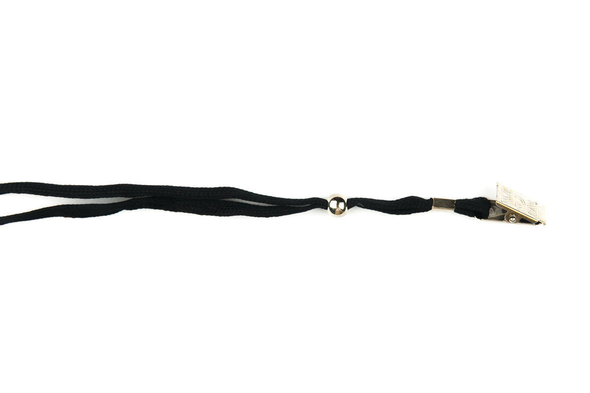 Siret textil detasabil este atasat de ecuson folosind o clema metalica. Culoarea siret este negru si albastru. Lungime 45 cm.