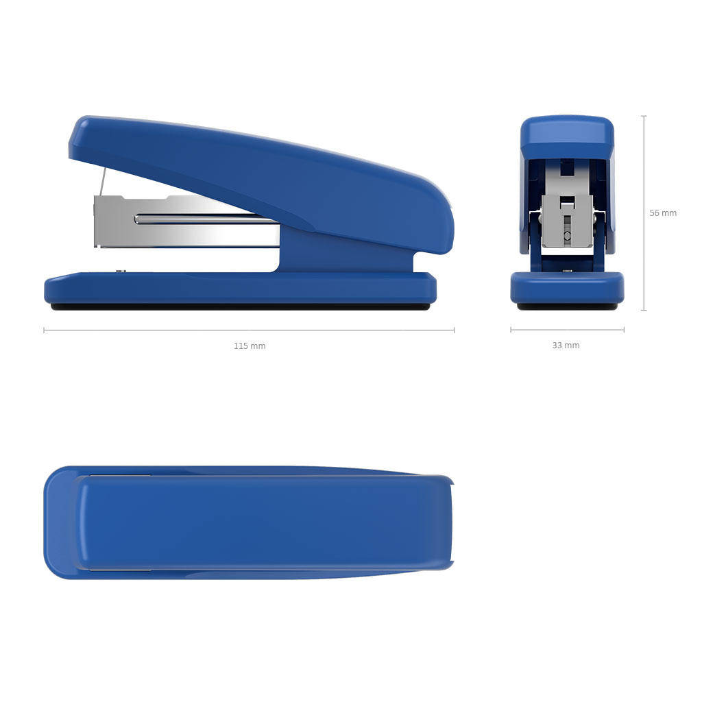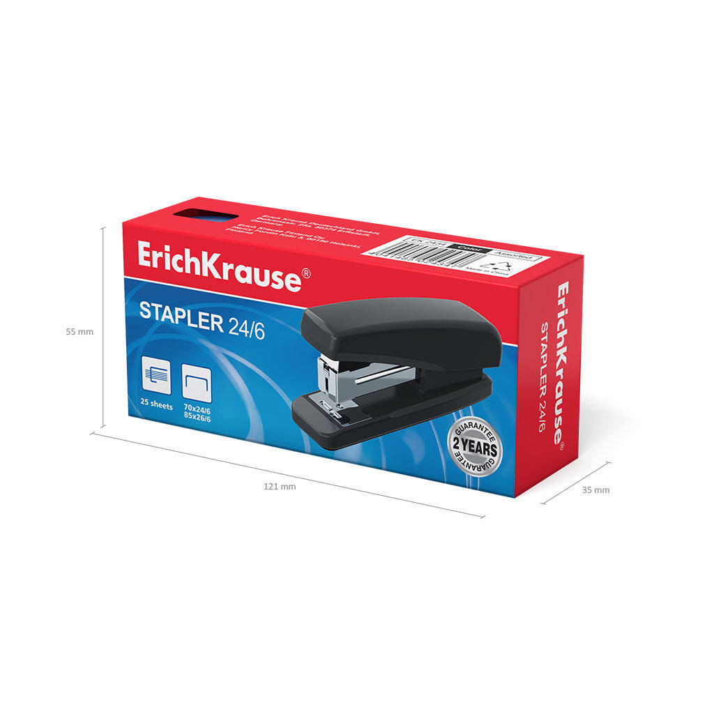 Capsatorul este realizat din plastic de inalta calitate si mecanism din otel. Contine pana la 70 de capse Nr 24/6 si pana la 85 de capse Nr 26/6. Perforeaza pana la 25 de foi. Adancimea de introducere a hartiei este de pana la 55 mm. Capsatorul vine in mai multe optiuni de culoare: sur, albastru si bordo.