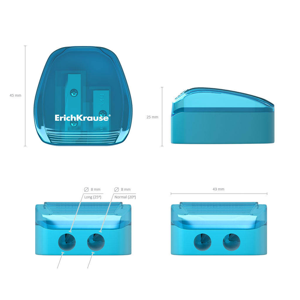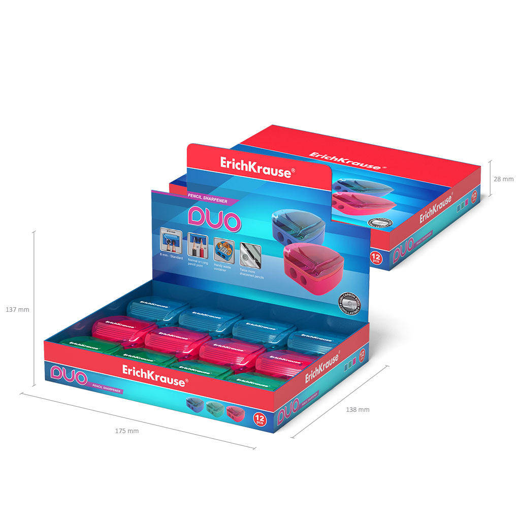Ascutitoare din plastic ErichKrause Duo in culori neon cu recipient pentru colectarea aschiilor. Are doua gauri cu un diametru de 8 mm pentru ascutirea normala si extinsa a creionului simplu standard si a creioanelor colorate. Lama din otel placata cu nichel de inalta calitate garanteaza performante ridicate. Dimensiune 45 x 25 x 43 mm. Culoarea corpului: turcoaz, albastru, roz. Ambalare: cutie display a cate 12 bucati