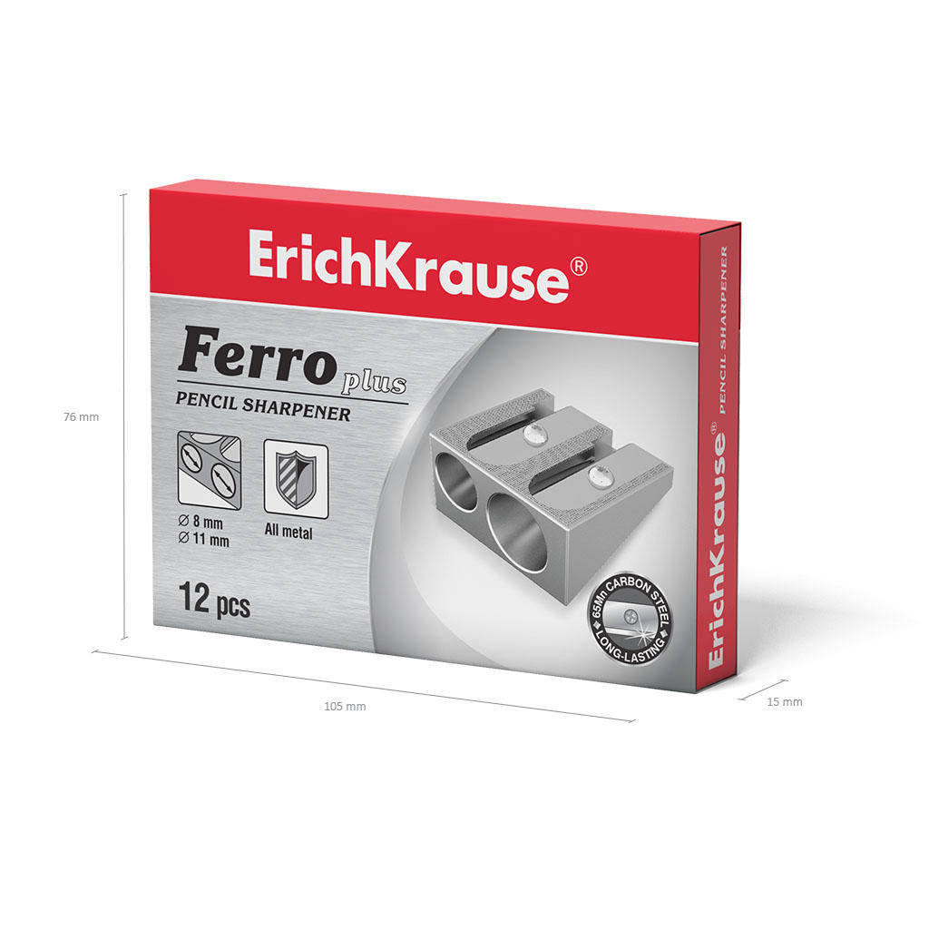 Ascutitoare metalica ErichKrause Ferro, cu doua gauri cu diametrul de 8 mm si 11 mm pentru ascutirea creioanelor standard si ingrosate (Jumbo). Lama din otel carbon placata cu nichel de inalta calitate garanteaza performante ridicate. Dimensiune 24 x 13 x 25 mm. Ambalaj: cutie de carton a cate 12 bucati.